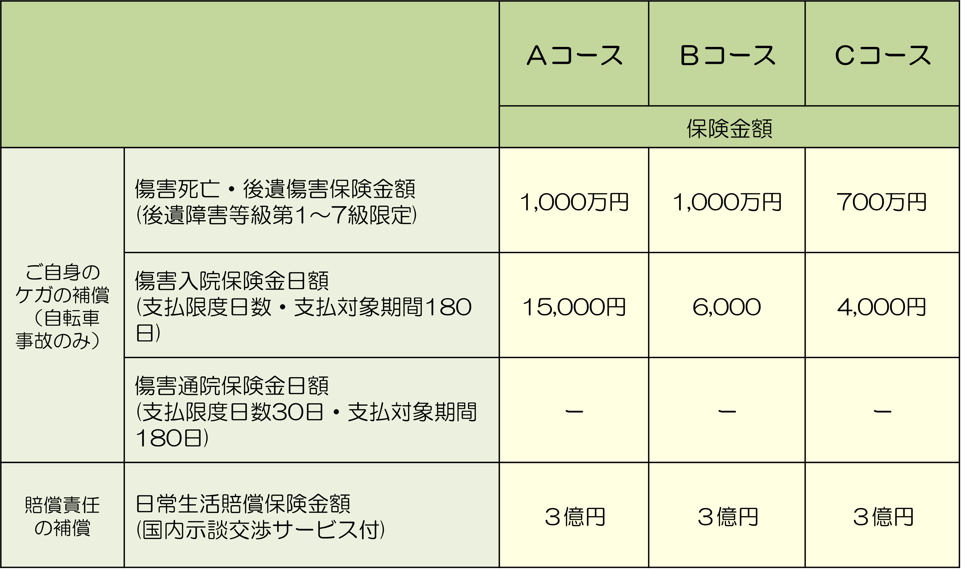 ケガの補償は、自転車搭乗中や自転車に搭乗していない場合に運行中の自転車と衝突、接触し被ったケガが補償対象です。